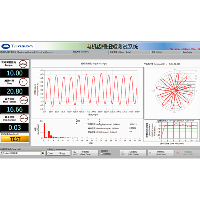 C0-MTS-100CT齒槽扭矩測試是通過伺服電機帶動扭矩轉速傳感器,扭矩轉速傳感器另外一端帶動被測電機旋轉360°,測試其力矩和角度的對應關系。因為齒槽扭矩一般都很小,受限于扭矩轉速傳感器的量程和測試工裝以及聯軸器等原因,所以很少有廠家能做到如此力矩的齒槽扭矩測量。