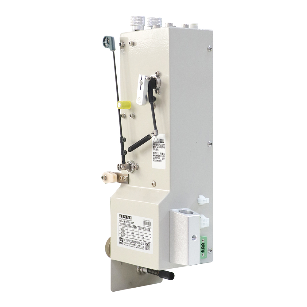 SF3-BRD系列帶氣缸且張力輪在正面的伺服張力器。該系列產(chǎn)品最高繞線速度可達20m/s,其氣缸裝在機殼內(nèi)部,具有衰減功能,未接通氣壓時,可通過張力調(diào)節(jié)旋鈕和擺動臂上下旋鈕來控制張力;在繞線、掛線等過程中的某段需要較大的張力時,可接通氣壓,此時繞線機通過電磁閥對氣閥進行切換控制,使擺動臂擋塊擺動一定的角度,實現(xiàn)兩段張力值的切換,避免發(fā)生斷線。該系列具體型號及配置見右側(cè)表格,用戶可根據(jù)自用線徑及張力范圍選擇合適的型號。