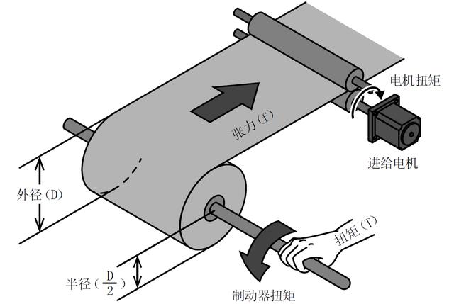 放卷部張力由設(shè)置在放卷部的磁粉制動(dòng)器的制動(dòng)器扭矩決定。為了保持一定的張力,需要在卷徑減小的同時(shí)減小制動(dòng)器扭矩。