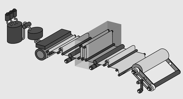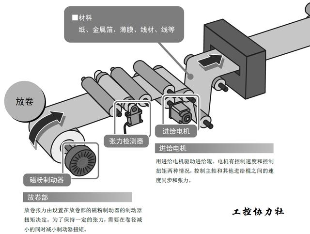 主軸電機(jī)驅(qū)動(dòng)主軸,并從左向右進(jìn)給長(zhǎng)形材料。電機(jī)的速度決定進(jìn)給速度(線速度),但與張力沒關(guān)系。不過,張力變大后需要輸出功率大的電機(jī)。