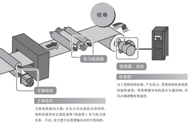 為了消除材料松弛、產(chǎn)生張力,需要控制收卷電機(jī)的旋轉(zhuǎn)速度。用變頻器對(duì)電機(jī)進(jìn)行矢量控制,可以正確調(diào)整收卷速度。