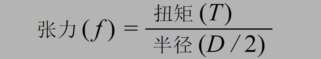 下面說明放卷長(zhǎng)形材料時(shí)的張力和扭矩的關(guān)系。扭矩是作用于旋轉(zhuǎn)軸的力。放卷長(zhǎng)形材料時(shí),卷軸的制動(dòng)扭矩(制動(dòng)器扭矩)比電機(jī)扭矩更弱,所以材料被向右側(cè)放卷。此時(shí),材料所受到的張力(f) 由較弱一側(cè)的制動(dòng)扭矩(T)決定, 扭矩(T) 和張力(f)的關(guān)系如下公式所示: