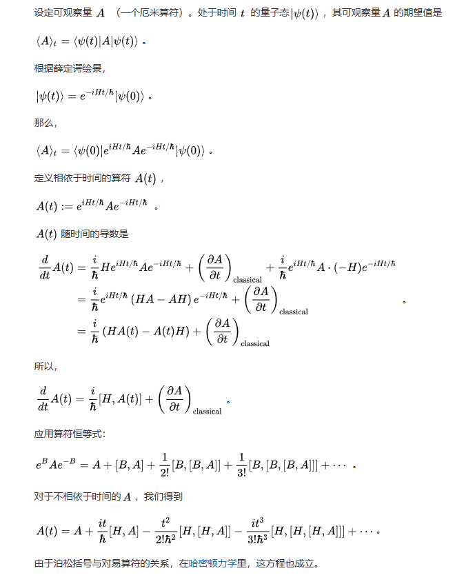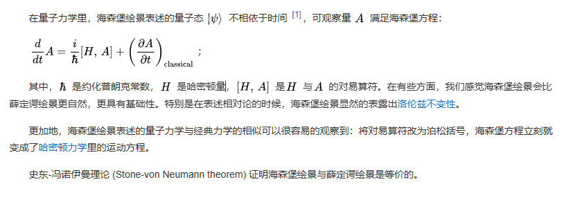 海森堡繪景是量子力學(xué)的一種表述。這表述的算符(可觀察量和其它算符)相依于時(shí)間,而量子態(tài)則不相依于時(shí)間。海森堡繪景與薛定諤繪景有很明顯的差異。薛定諤繪景表述的算符是常數(shù),而量子態(tài)則隨著時(shí)間演化。雖然有這些差異,兩種繪景只是不同于依賴(lài)時(shí)間的基底的改變。兩種繪景的測(cè)量統(tǒng)計(jì)結(jié)果完全相同。這是必然的。因?yàn)?,它們都是在表達(dá)同樣的物理現(xiàn)象。海森堡繪景是矩陣力學(xué)在一個(gè)任意基底的表述。其哈密頓量不一定是對(duì)角的。