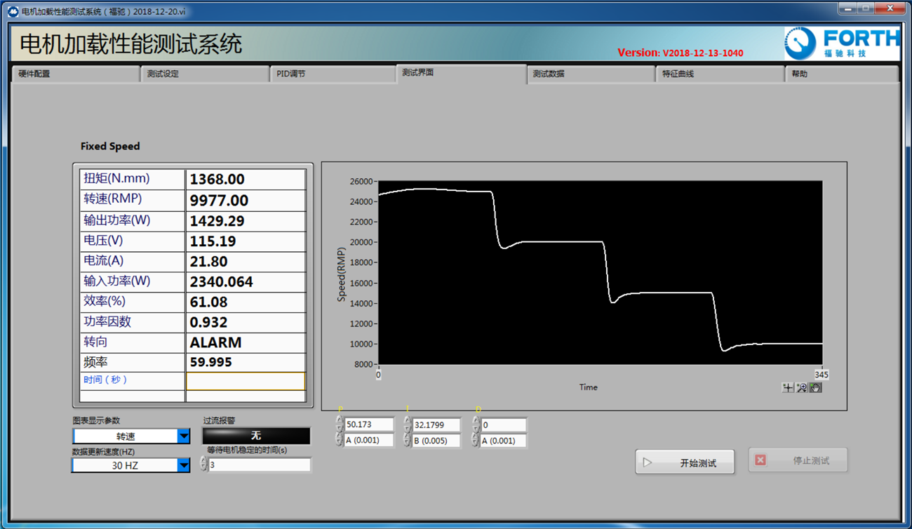 4.測試軟件用LABVIEW編寫, 具有特色的測試與圖形繪制功能,可以計算并顯示多個參數(扭矩, 轉速, 輸出功率,電壓,電流, 輸入功率, 效率, 轉向等)