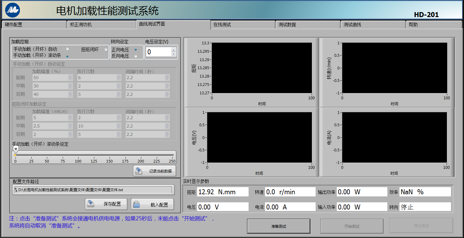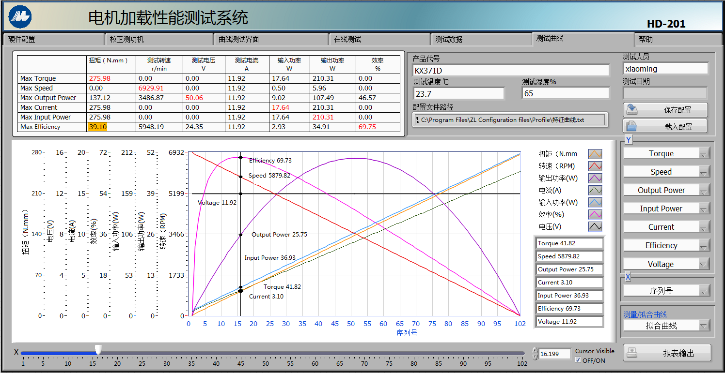 4.測試軟件用LABVIEW編寫,具有特色的測試與圖形繪制功能,可以計算并顯示多個參數(shù)(扭矩,轉(zhuǎn)速,輸出功率,電壓,電流,輸入功率,效率,轉(zhuǎn)向等)